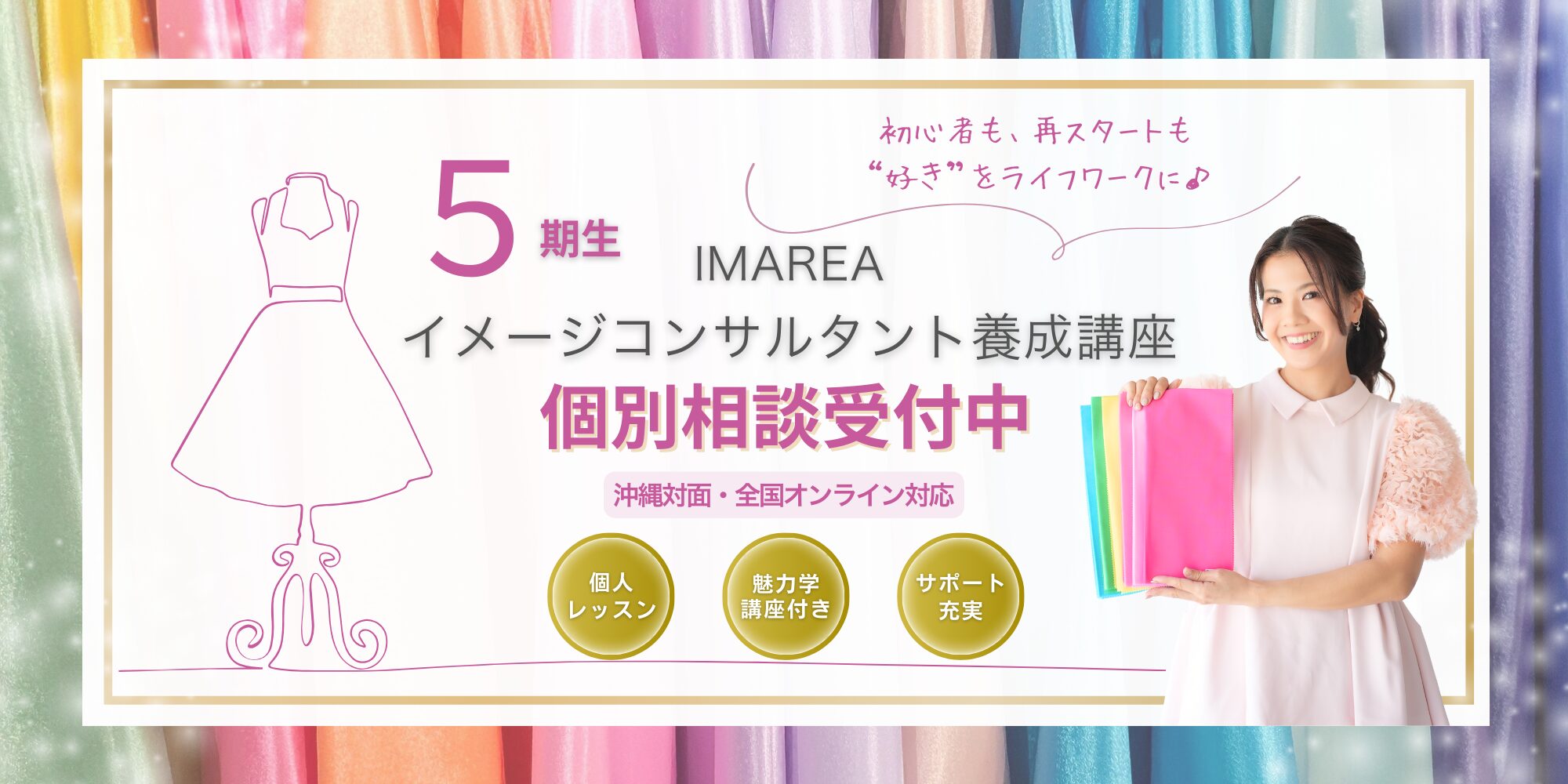 募集中の講座 2024.04.212026.02.04 イメージコンサルタント養成講座5期生 募集間も無く開始!公式LINEに登録して、5期生の募集をお待ちください♡ 詳細ページはこちら 魅力学講座7期生(2/4〜募集中) 次回の募集をお待ちください♡ 詳細ページはこちら イメージコンサルティングメニュー 詳細ページはこちら